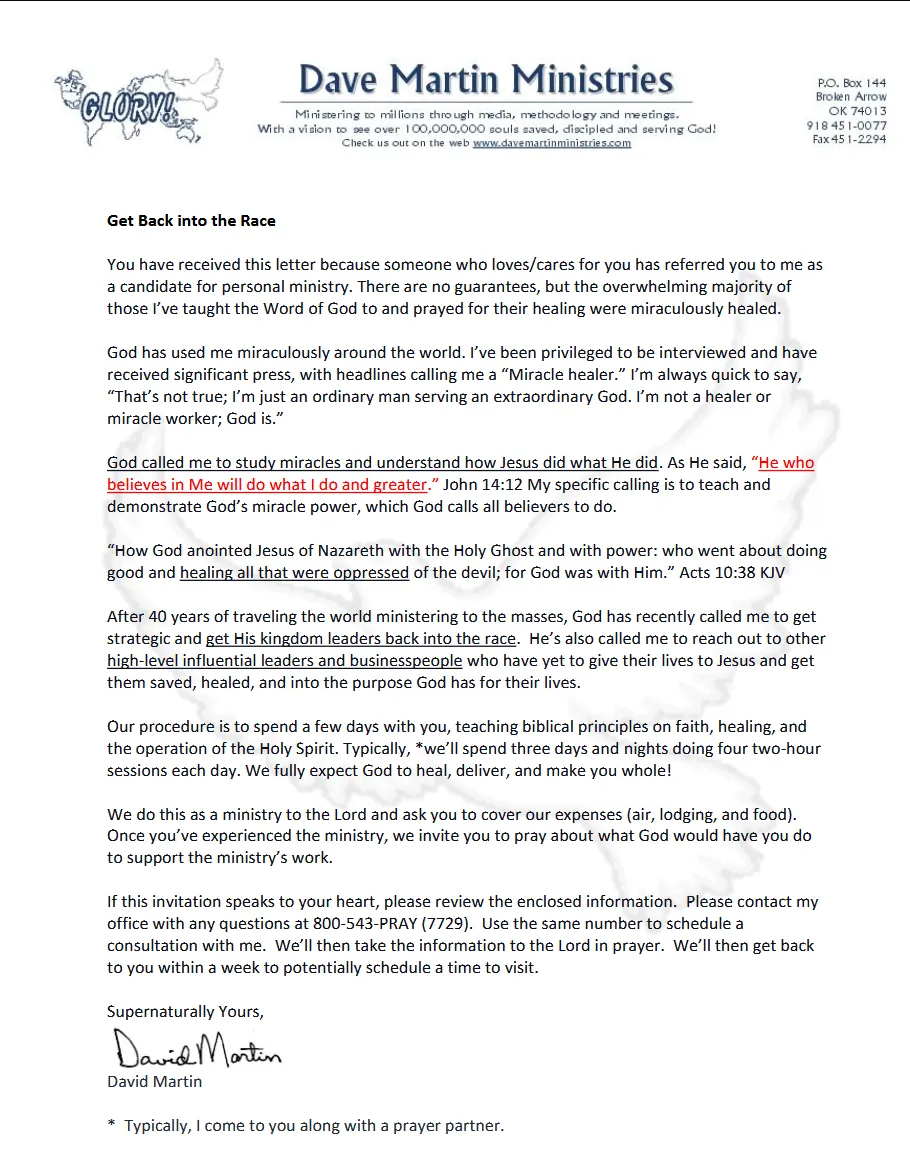 International Evangelist, Teacher, and Revivalist. Dr. David Martin of Dave Martin Ministries has traveled the world extensively, teaching pastors and doing leadership meetings with business, political, and church leaders in conjunction with ministry conferences and evangelistic crusades. Over the last 35 years, David has been featured on the front pages of newspapers and television shows due to the many signs, wonders, and